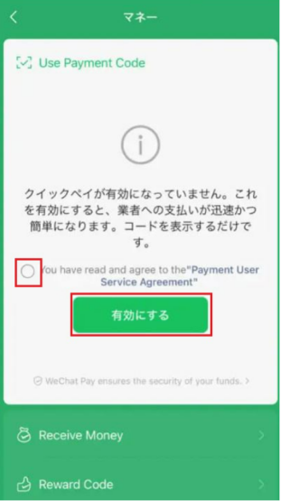 Payment User Service Agreementにチェックを入れて、「有効にする」をタップします。
