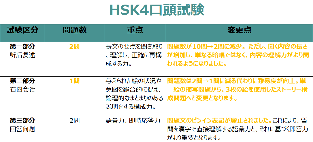 変更点の核心:第二部分は出題の本質は変わらず、第三部分では問題文からピンイン表記がなくなり、漢字を直接読解する語彙力と応答力が試されます。